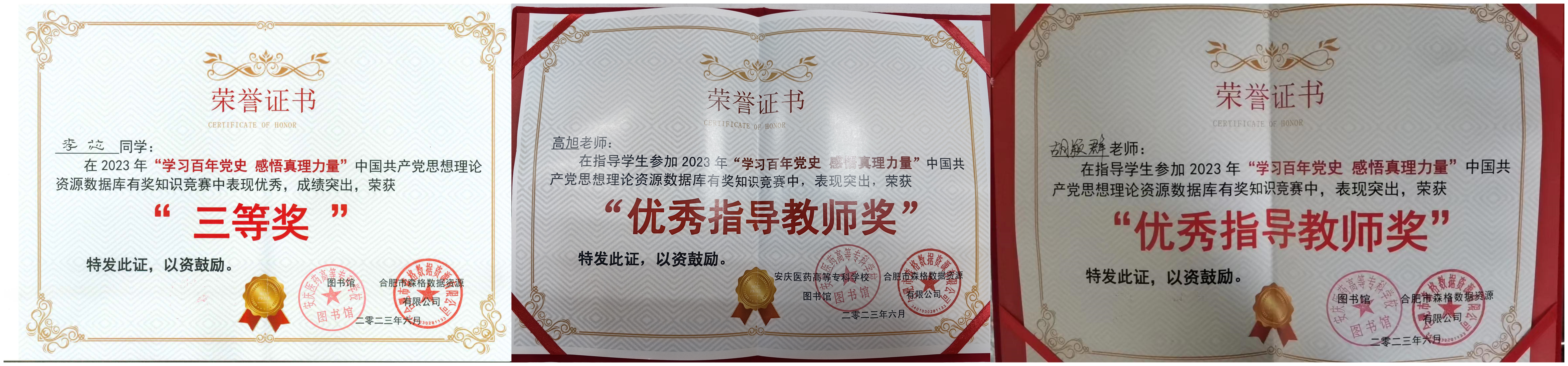 在合肥市森格數(shù)據(jù)資源有限公司于4月10日至5月31日舉辦的安徽省首屆“中國共產(chǎn)黨思想理論資源數(shù)據(jù)庫”有獎(jiǎng)知識競賽活動(dòng)中,校圖書館負(fù)責(zé)人高旭、馬克思主義學(xué)院副院長胡穎群榮獲“優(yōu)秀指導(dǎo)教師獎(jiǎng),護(hù)理學(xué)院護(hù)理(專科)21級6班李芯榮獲全省三等獎(jiǎng),護(hù)理學(xué)院劉謹(jǐn)?shù)热煌瑢W(xué)榮獲全省優(yōu)秀獎(jiǎng)。
