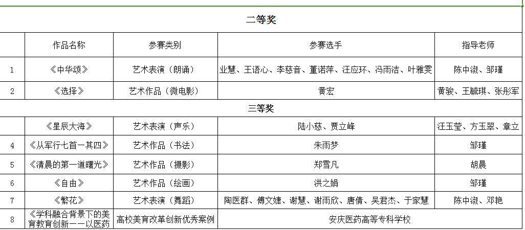 近期,安徽省教育廳對全省第七屆大學生藝術展演獲獎名單進行公示,我校在本屆藝術競賽中取得突破性進展,共獲得二等獎2項、三等獎6項的好成績,獲獎類別涵蓋朗誦、微電影、聲樂、舞蹈(集體)、書法、繪畫六大類,并獲評高校美育改革創新優秀案例1篇,再創我校在此項賽事中獲獎數量和類別的新高。