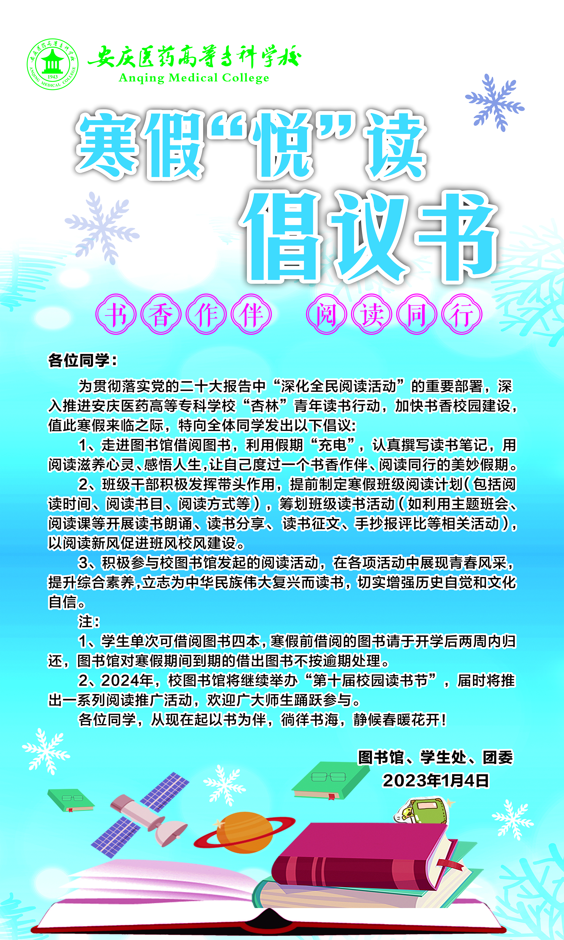 一元初始,萬(wàn)象更新,在辭舊迎新之際,校圖書(shū)館根據(jù)讀者2023年度閱讀數(shù)據(jù),隆重推出兩大榜單:安慶醫(yī)藥高等專(zhuān)科學(xué)校2023年度“悅”讀榜單(文學(xué)類(lèi))、安慶醫(yī)藥高等專(zhuān)科學(xué)校2023年度“悅”讀榜單(醫(yī)學(xué)類(lèi)),并在寒假來(lái)臨之際,聯(lián)合校學(xué)生處、團(tuán)委向讀者發(fā)出“寒假‘悅’讀倡議書(shū)”。(撰文:高旭、王笑天;供圖:高旭、王笑天;審核:高旭)