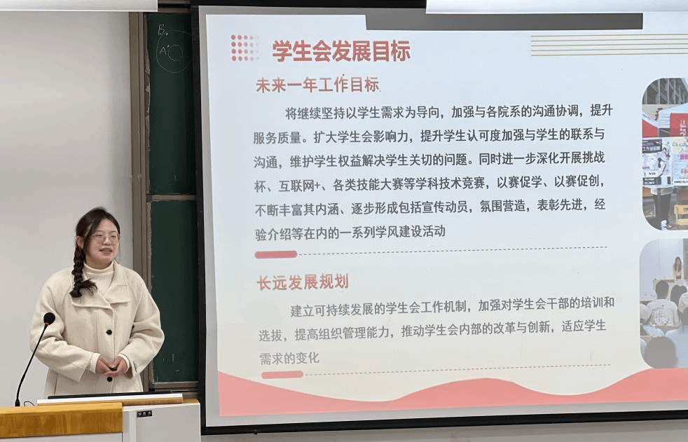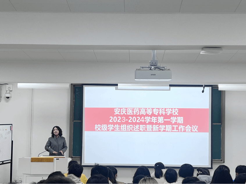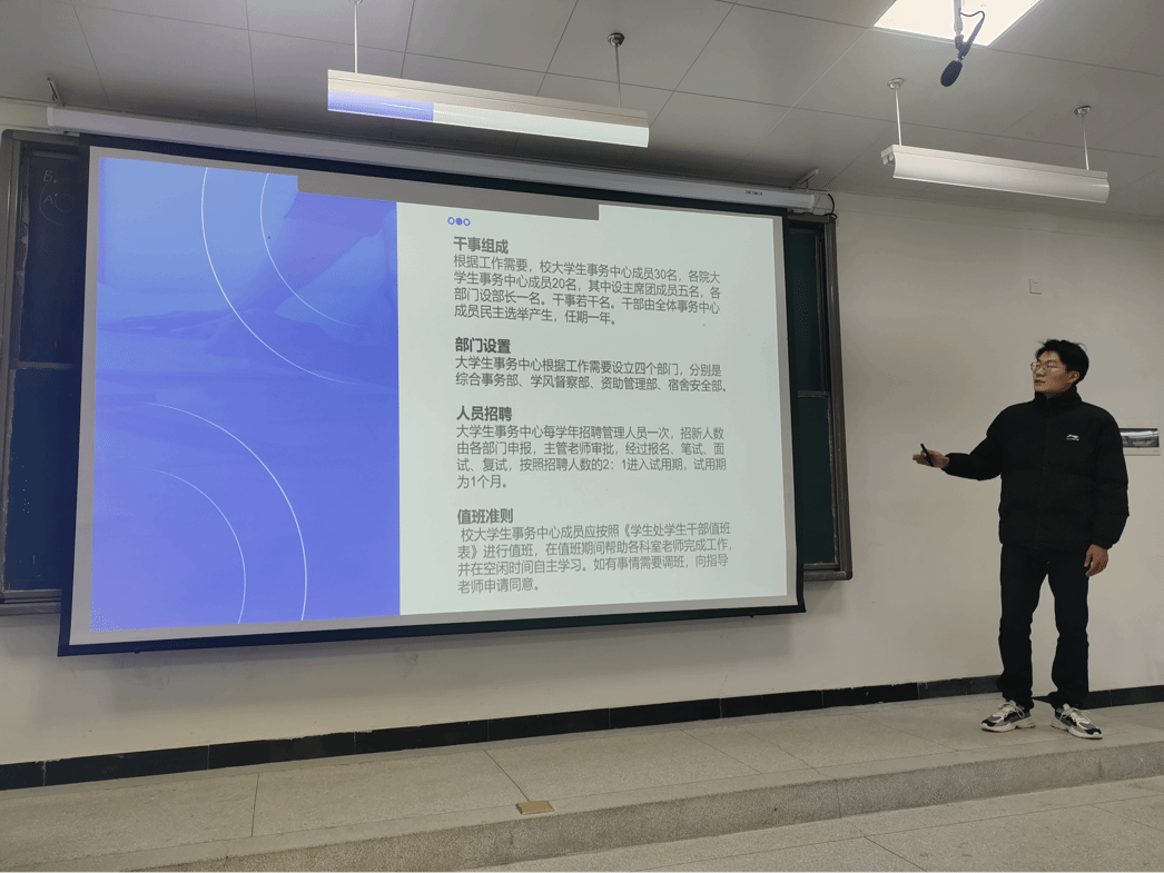 2024年2月29日中午,2023-2024學年第一學期校級學生組織述職暨新學期工作會議在我校第九階梯教室召開,校黨委委員、黨政辦主任陳琪出席,學生處、團委負責人,各校級學生組織指導老師及校學生會委員會委員擔任評委,校級組織部門負責人以上主要學生干部參加會議。
