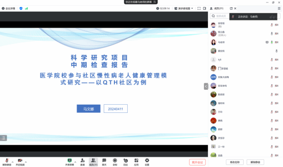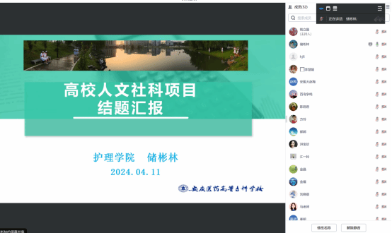 為扎實推進學院科研工作,加強科研項目過程管理,提高科研項目研究質(zhì)量,護理學院按照學校科研項目管理辦法要求,于4月11日線上開展了2024年科研項目開題、中期檢查和結題驗收評審會。特邀安徽醫(yī)科大學護理學院洪靜芳等5位教授擔任本次活動的評審專家。學院全體教職工參會。