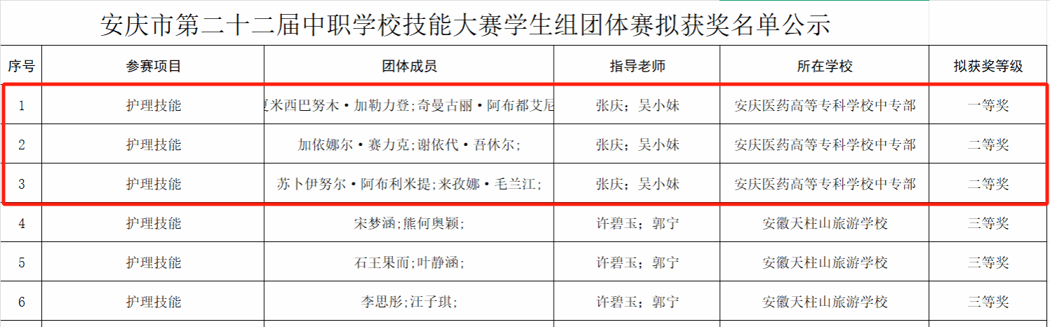 2025年5月24日,安慶市第二十二屆中等職業院校護理技能大賽在安徽天柱山旅游學校圓滿落幕。我校組織護理(中職新疆)學生參賽,以出色的表現包攬比賽一、二等獎,充分展現了我校護理專業的教學實力和學生的綜合素質。