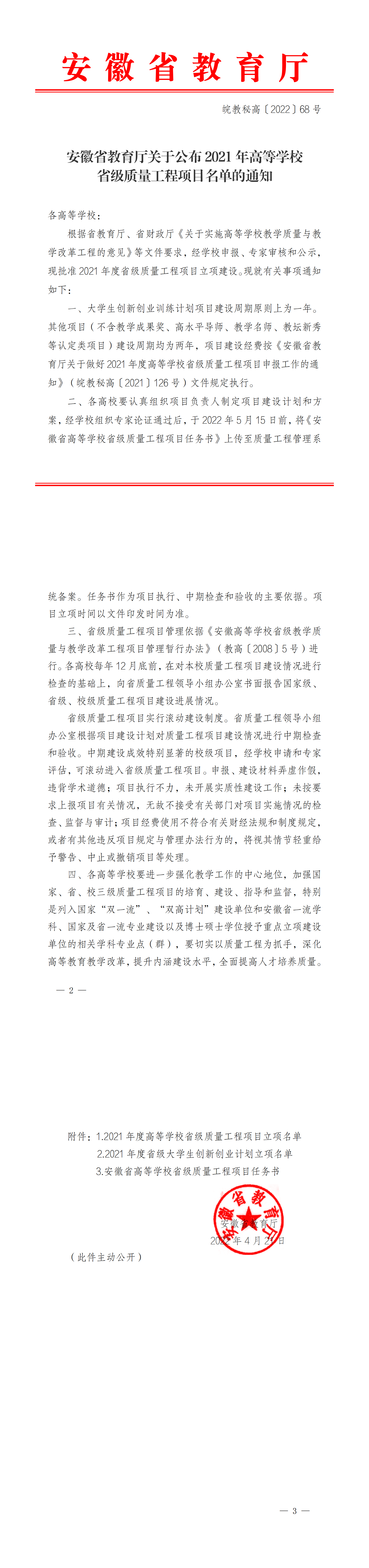 安徽省教育廳關于公布2021年高等學校省級質量工程項目名單的通知