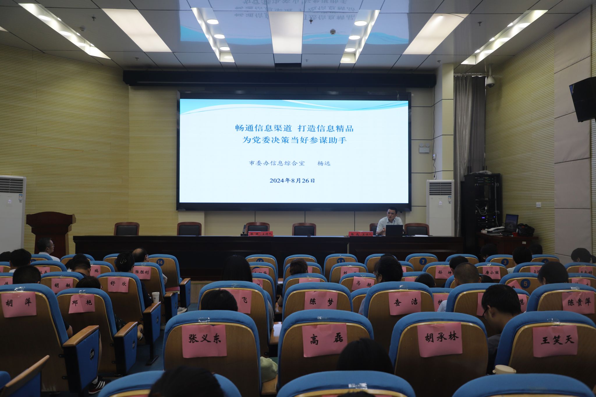 安慶市委辦信息綜合室主任楊遠以《暢通信息渠道 打造信息精品 為黨委決策當好參謀助手》為題,從宏觀、微觀、實踐的角度,深入解讀“了解什么是寫作、理解什么是信息、掌握當前信息寫作存在的問題”,對公文特點、行文規則、寫作技巧等進行介紹。